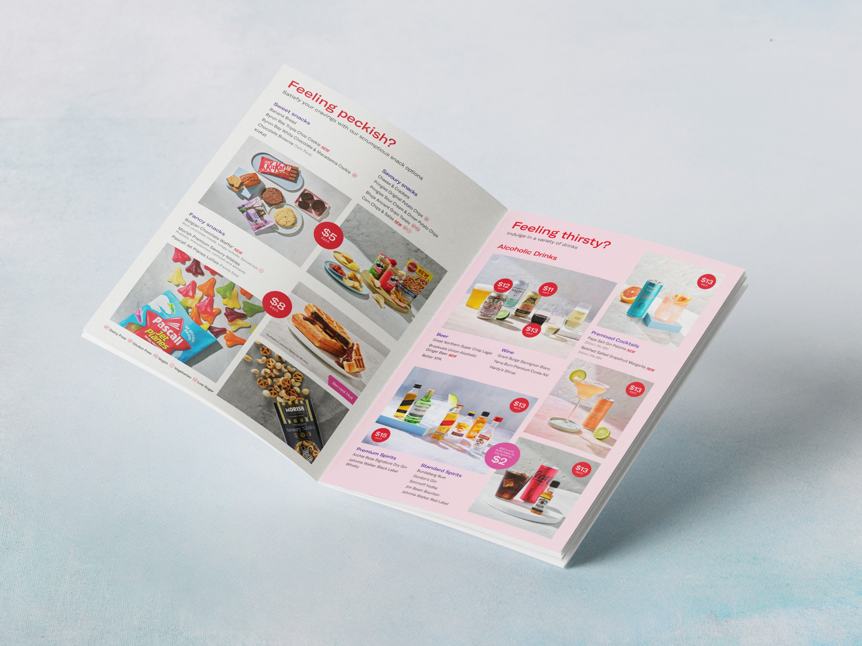 The onboard retail menu gets a seasonal update every six months, but this edition called for more than a basic switch-out. The summer refresh introduced a lighter visual tone and clearer structure, while shifting emphasis toward imagery to better reflect the onboard experience. Layouts were reworked to feel more editorial, allowing hero photography to carry more weight across key sections. Pricing was simplified and repositioned, making room for a cleaner visual hierarchy and exploring future flexibility with Velocity Points. What began as a straightforward update became an opportunity to subtly evolve the brand’s onboard presence without disrupting its foundations.