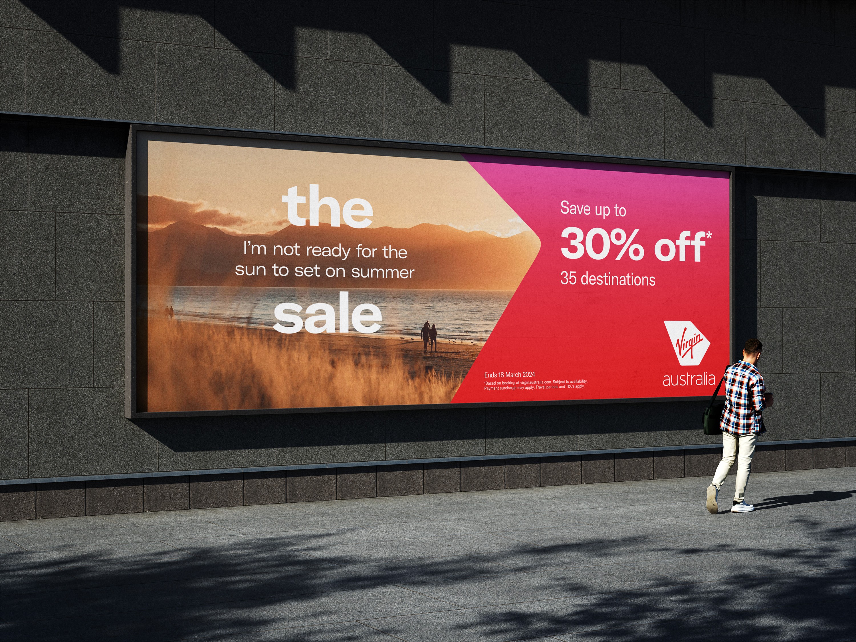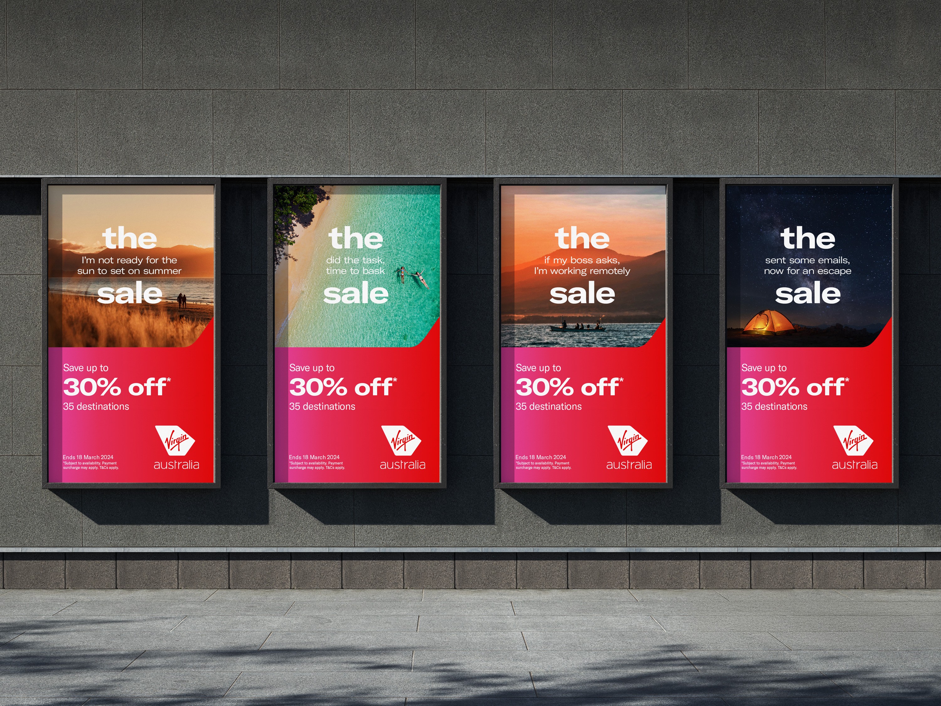 The Sale campaigns are Virgin Australia’s most visible retail moments, designed to be instantly recognisable and emotionally resonant. Built around a consistent message format and bold visual language, the creative lands with charm and familiarity wherever it appears. Each rollout was led end-to-end, adapting the core concept across a wide mix of owned and paid channels. Layouts were tailored to suit format and placement, balancing headline, imagery and branding with clarity and restraint.